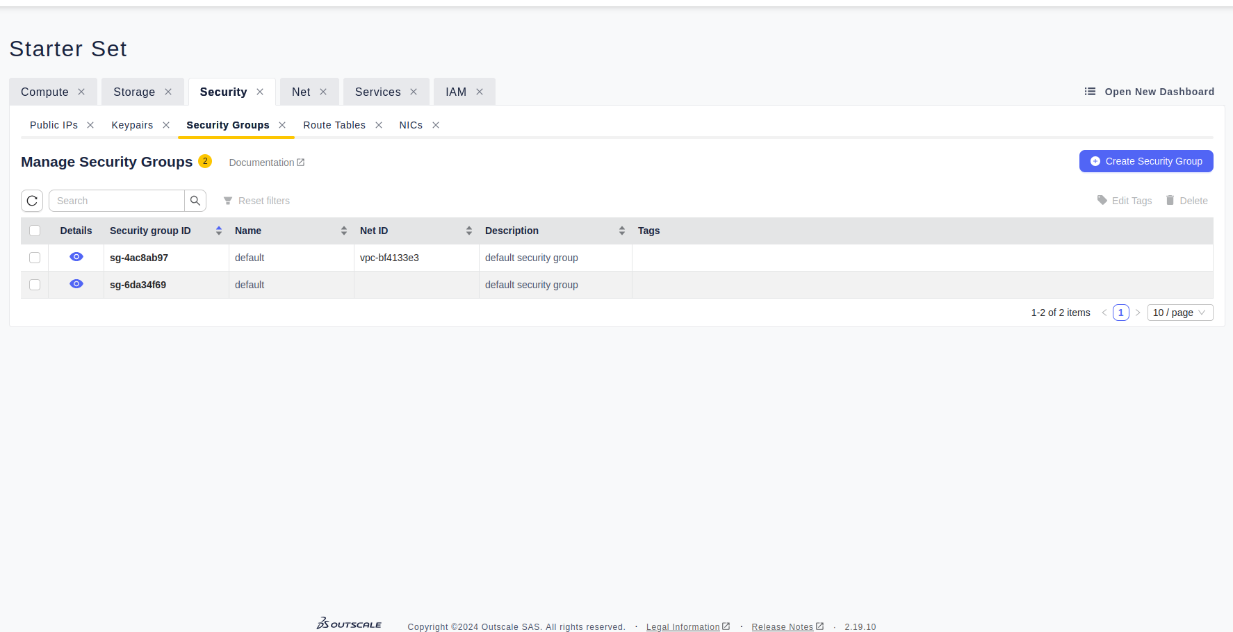 Vous devez appercevoir les deux groupes de sécurité par défaut : un pour le net du PoC, l’autre pour le cloud public.