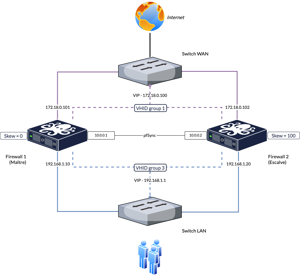 Chaque interface virtuelle doit avoir un identifiant d’hôte virtuel (vhid) unique, qui est partagé entre les machines physiques. Pour déterminer quelle machine physique a la priorité la plus élevée, le skew annoncé est utilisé. Avec un skew plus faible, la priorité est plus élevée. (notre pare-feu principal utilise 0).
