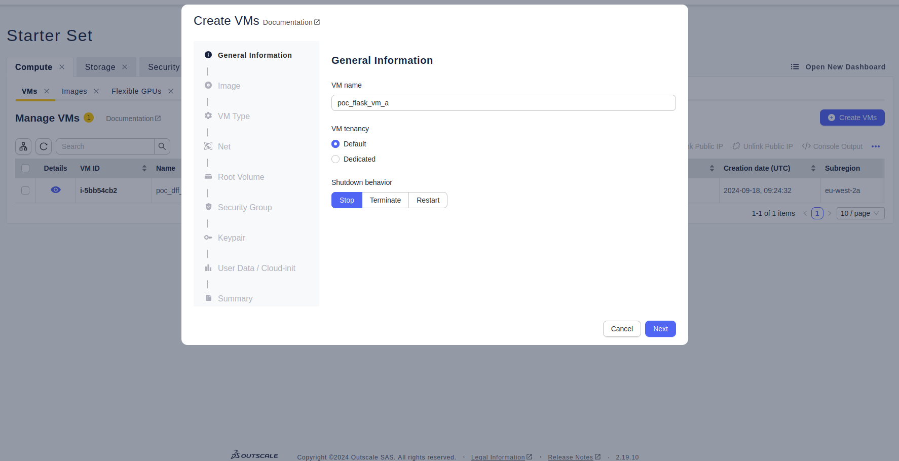 (Dans ce tutoriel, nous définissons les adresses IP de manière statique, mais vous n’êtes pas obligé de les attribuer, Outscale peut s’en charger.)